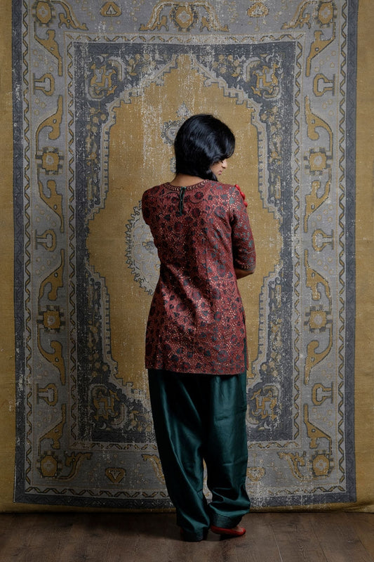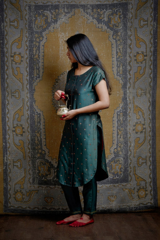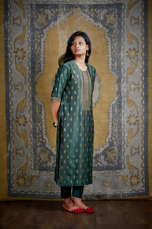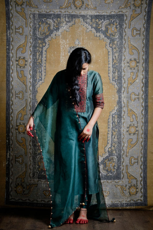The embroidery in this line is a collectors dream. The chanderi silk fabric is first stretched across the adda and an intricate Jaal is screened on by applying lep to the khakha. Then the fabric is embroidered twice over. First with silk threads and then with zari and sequence.